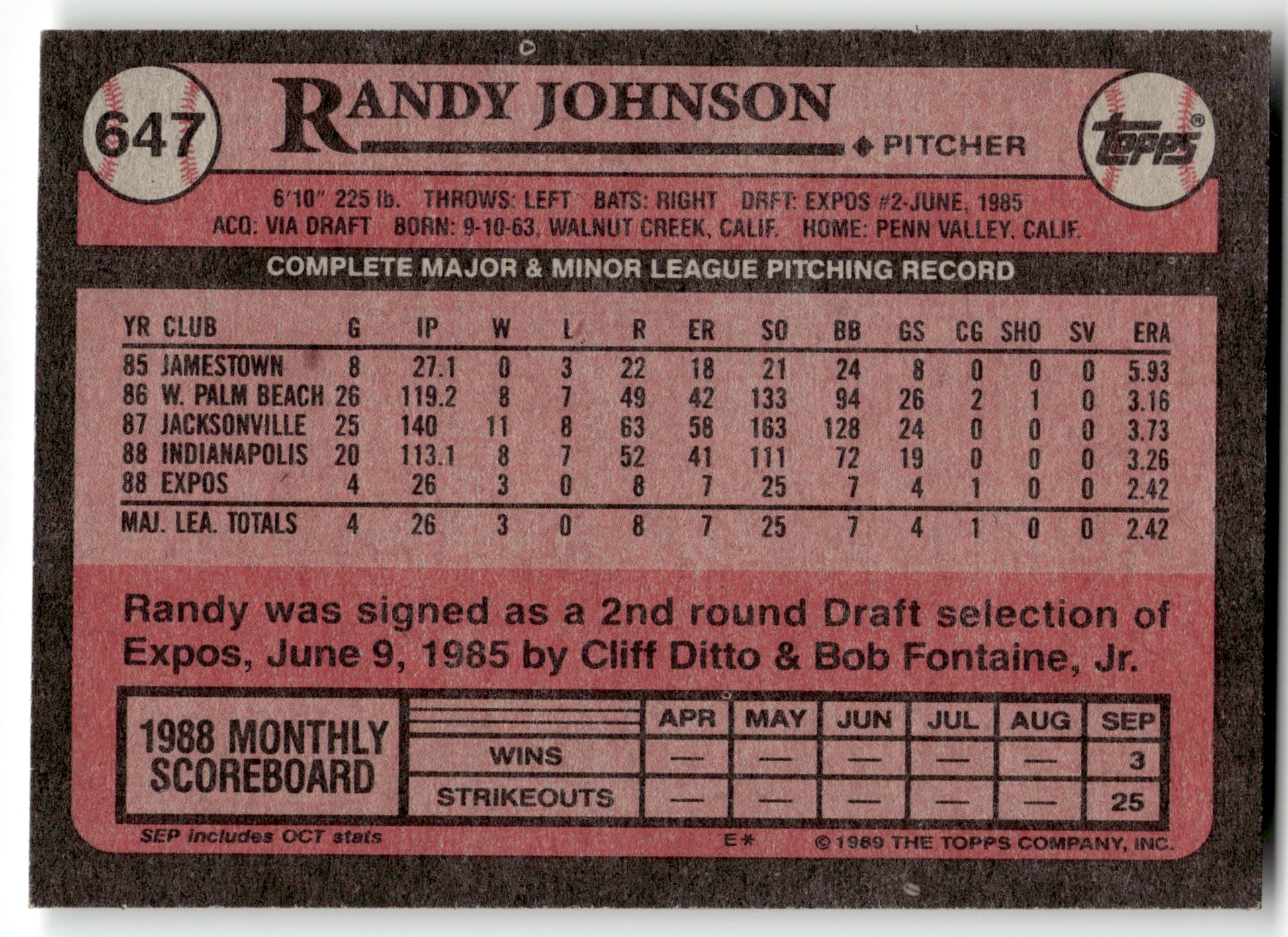 Card: Randy Johnson Team: Montreal Expos Card No: #647 Set: 1989 Topps Year: 1989 Brand: Topps Location: Assoted 001 001 001 B