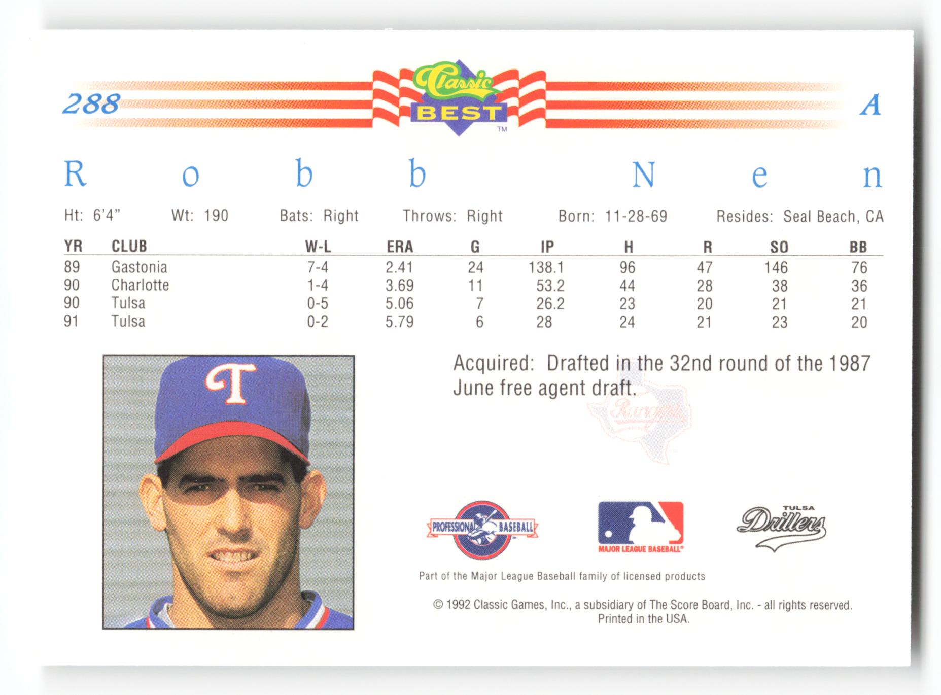 Card: Robb Nen Team: Tulsa Drillers Card No: #288 Set: 1992 Classic Best Year: 1992 Brand: MLB Location: Baseball 001 001 5 Sec A