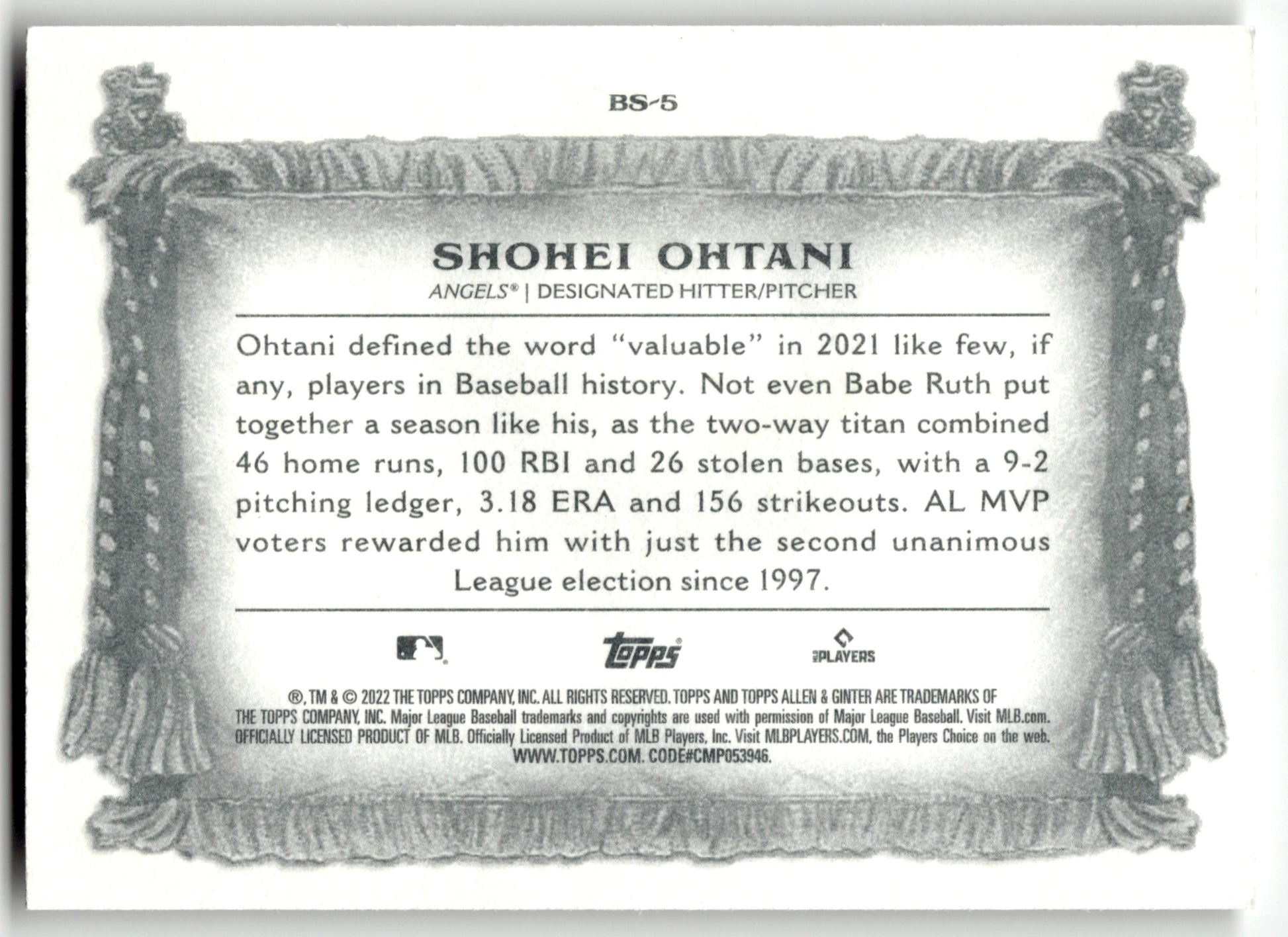 Card: Shohei Ohtani Team: Los Angeles Angels Card No: #BS-5 Set: 2022 Topps Allen & Ginter Year: 2022 Brand: Topps Location: Assorted 001 001 001 G
