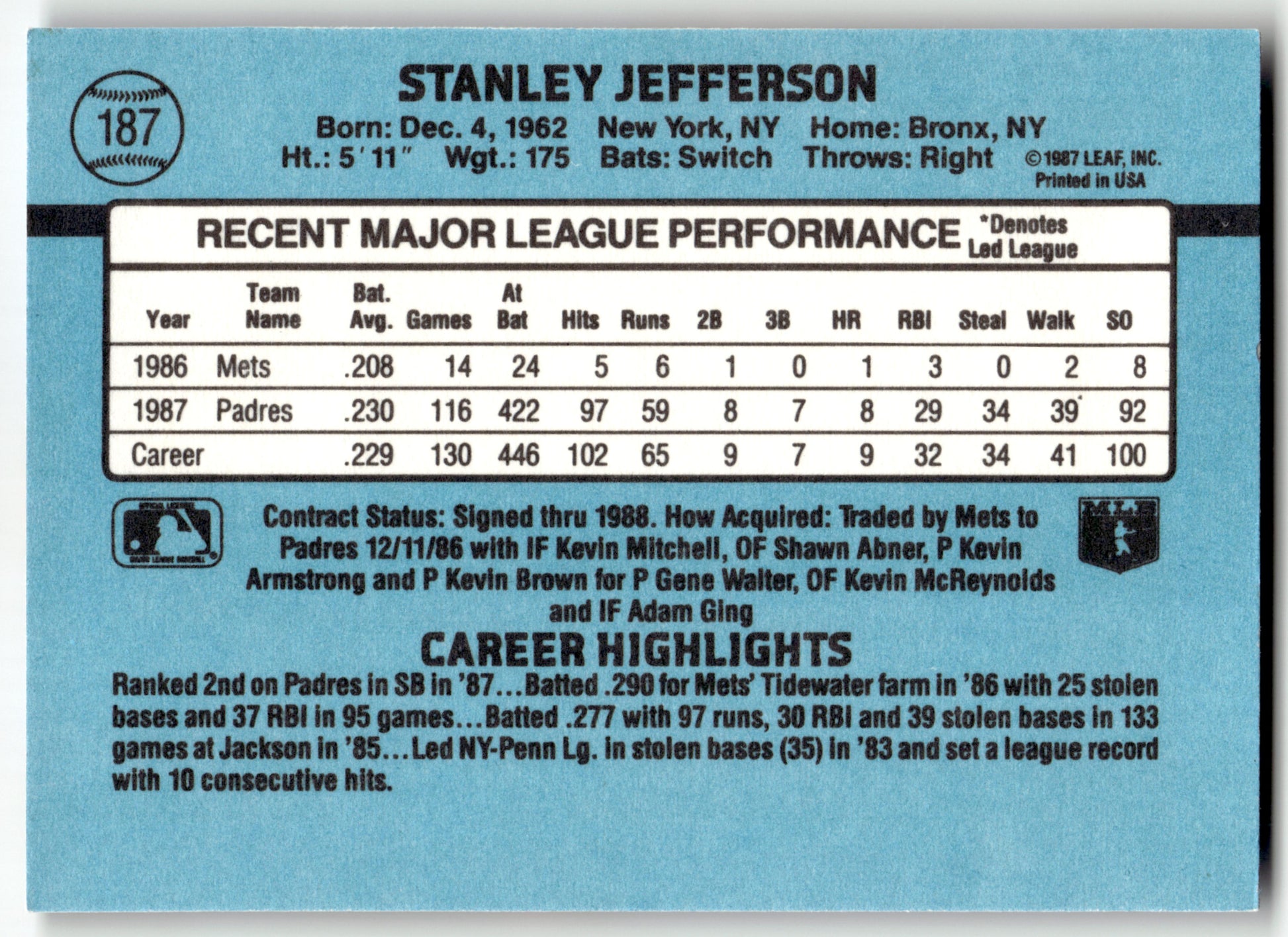 Card: Stan Jefferson Team: San Diego Padres Card No: #187b Set: 1988 Donruss Year: 1988 Brand: Donruss Location: Assoted 001 001 001 B