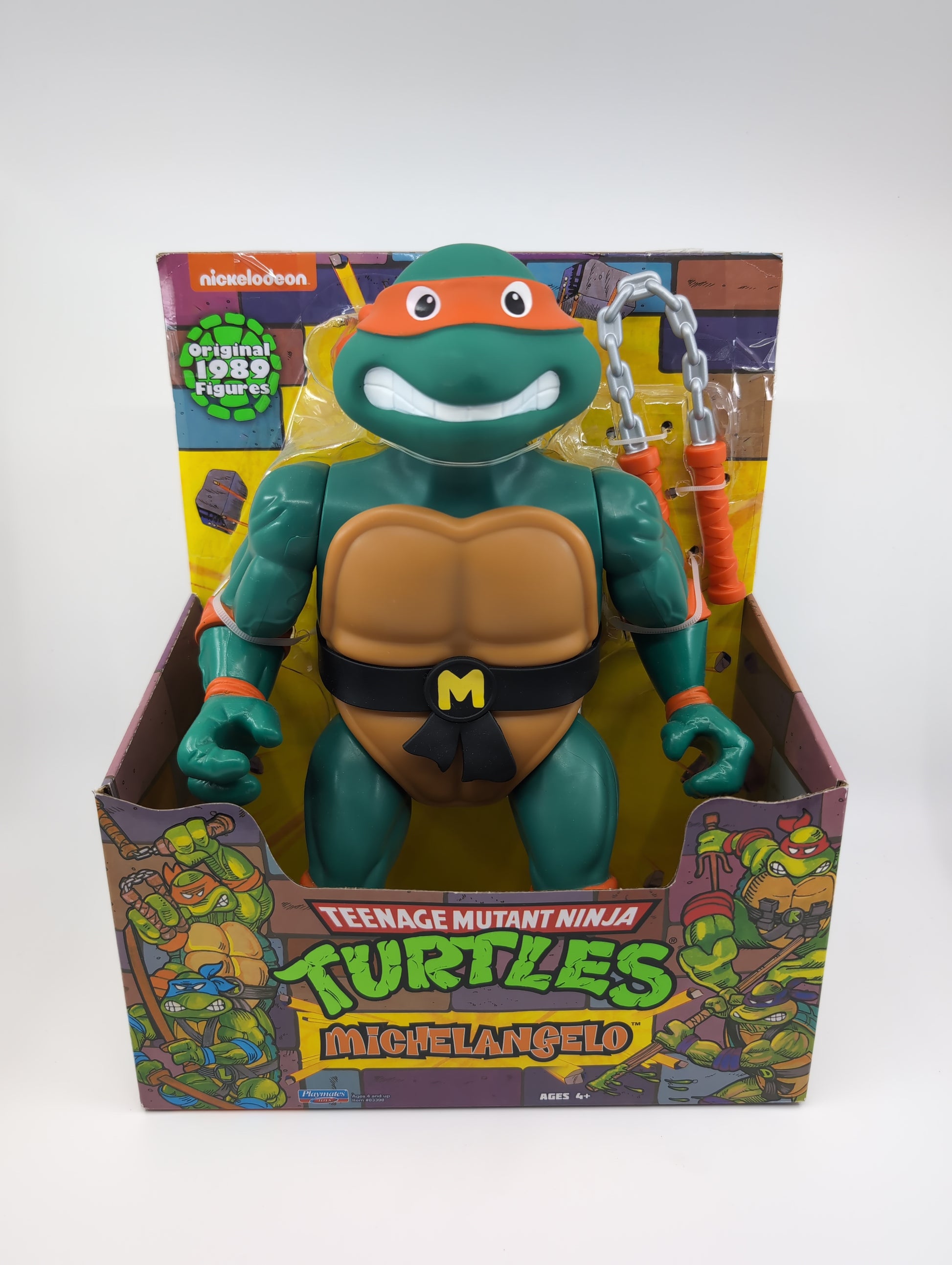 Kick it old-school with this TMNT Original 1989 Figures Giant Michelangelo figure from Playmates Toys. This oversized Mikey stands 12 inches tall with poseable head, arms, and legs, and he comes ready for action with his signature nunchucks. Styled to match the classic late-80s look and packed in retro-inspired packaging, it’s a perfect shelf piece for collectors chasing that vintage Turtle vibe.