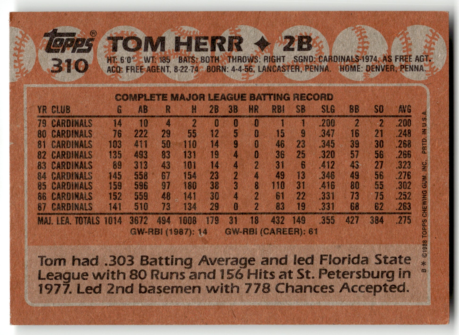 Card: Tom Herr Team: St. Louis Cardinals Card No: #310 Set: 1988 Topps Year: 1988 Brand: Topps Location: Assorted 001 001 001 C