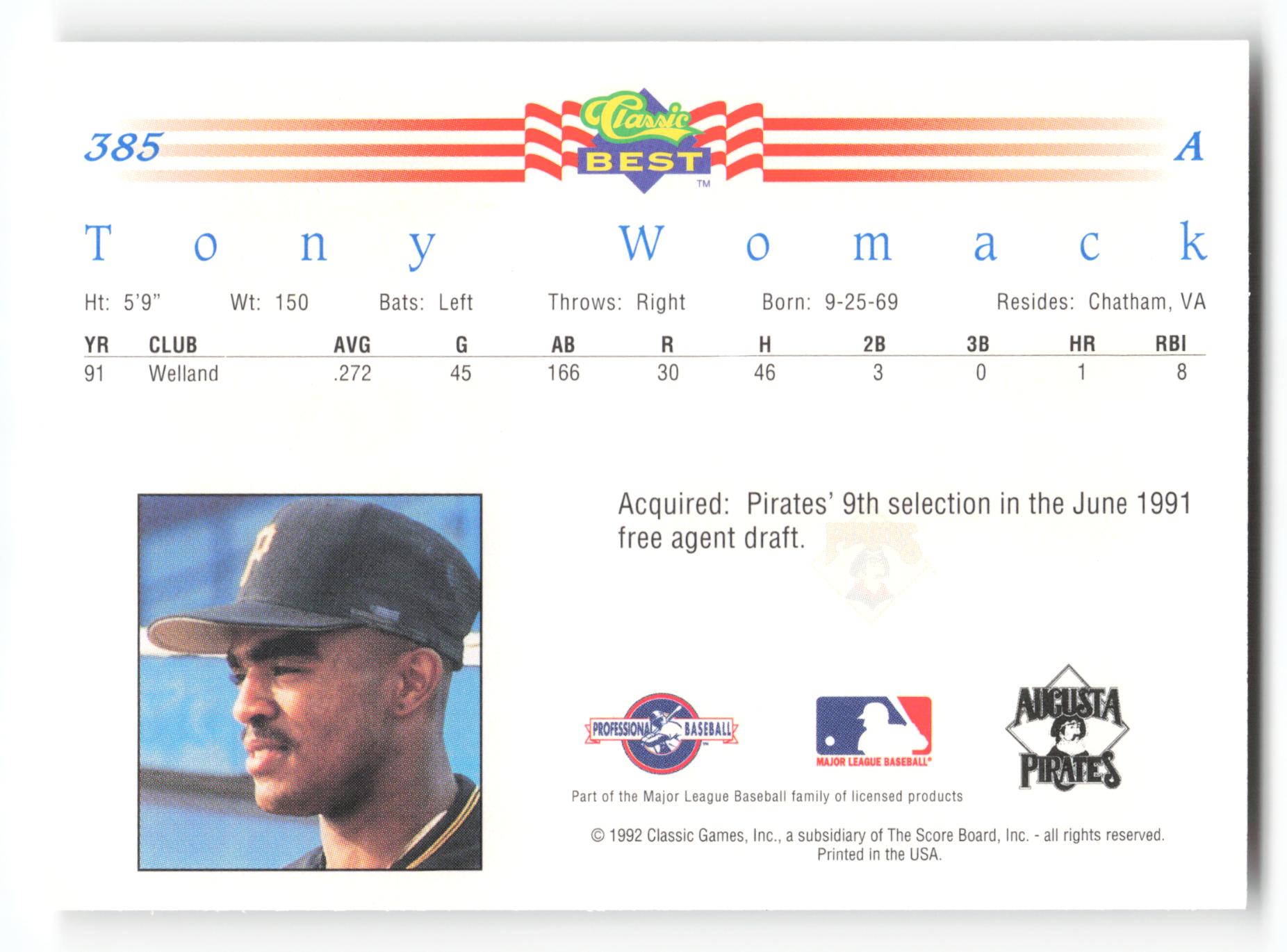 Card: Tony Womack Team: Augusta Pirates Card No: #385 Set: 1992 Classic Best Year: 1992 Brand: MLB Location: Baseball 001 001 5 Sec A