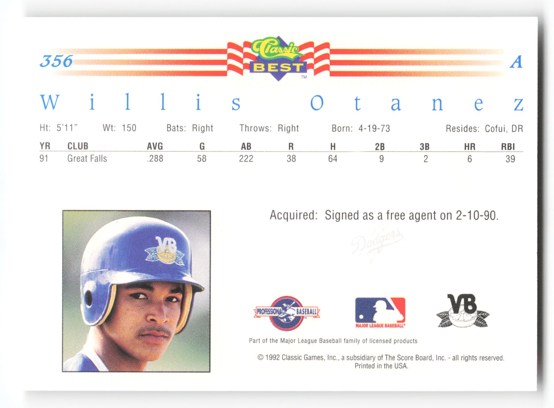 Card: Willis Otanez Team: Vero Beach Dodgers Card No: #356 Set: 1992 Classic Best Year: 1992 Brand: MLB Location: Baseball 001 001 5 Sec A