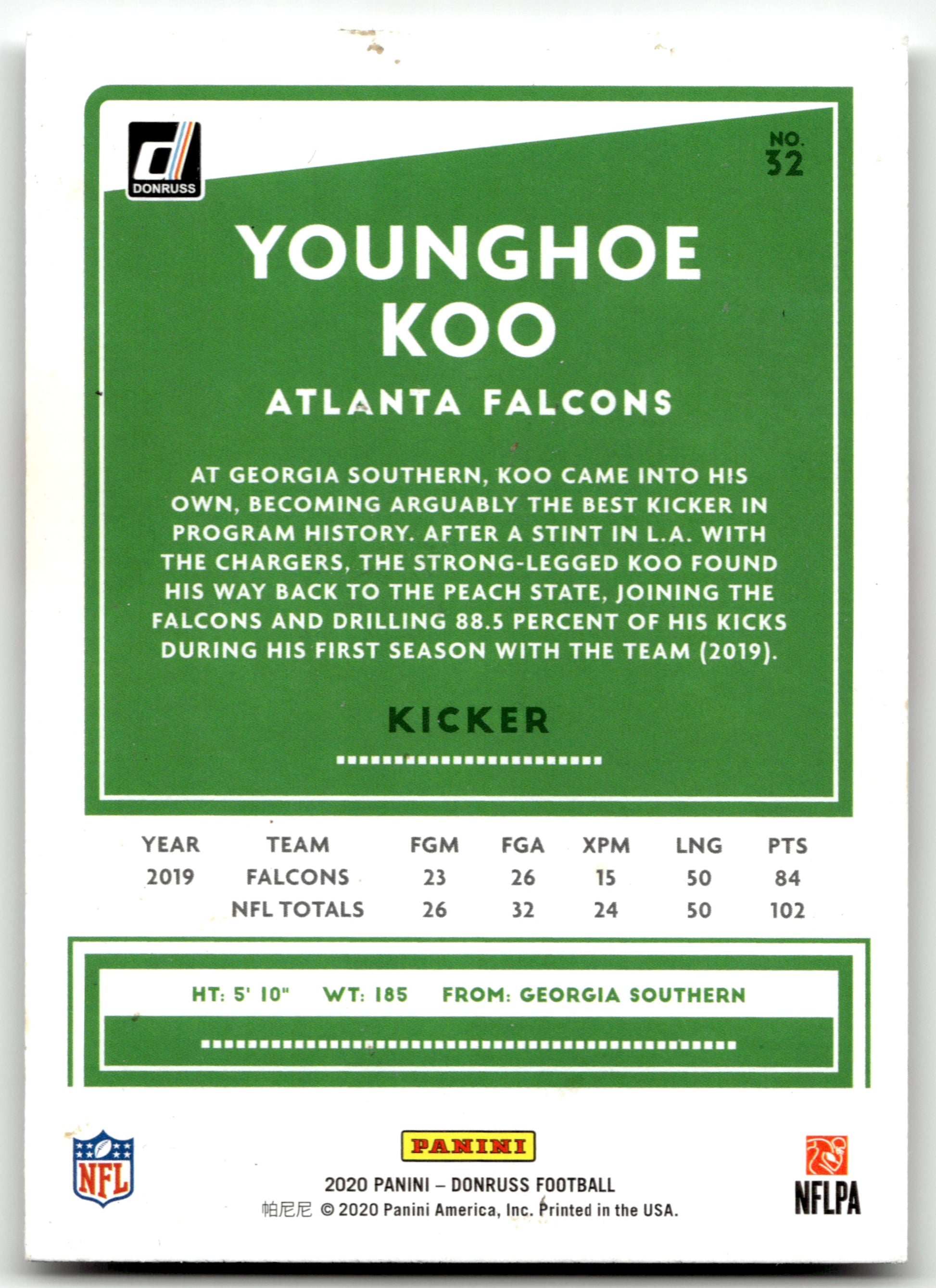 Card: Younghoe Koo Team: Atlanta Falcons Card No: #32 Set: 2020 Donruss Year: 2020 Brand: Donruss Location: Assorted 001 001 001 E